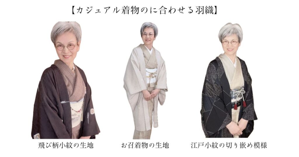 例えば、小紋の着物でも紋付の羽織を羽織れば、少しきちんとした場に出られる。