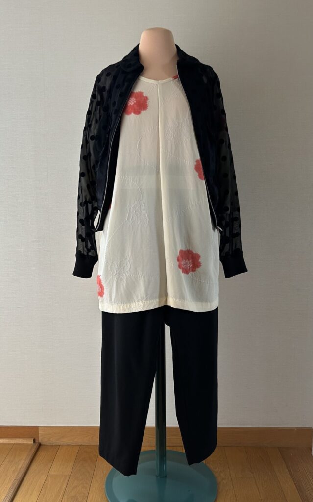 リメイクしたブラウスやパンツはほとんどフリーサイズなので、インナーにもアウターにも使え、幅広いサイズに対応できます。