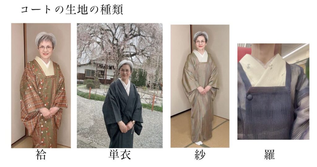 防寒目的の袷コート、軽さを重視した単衣コート、夏用の透ける羅や紗のコート。